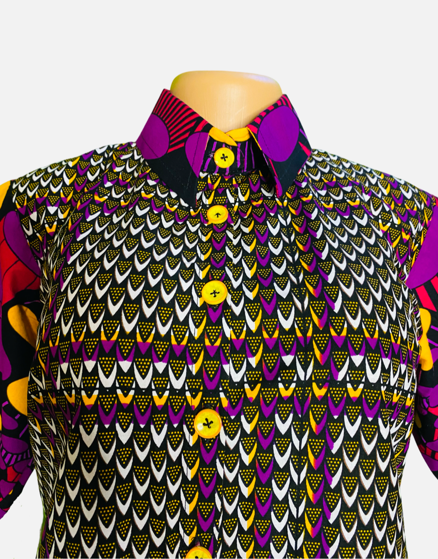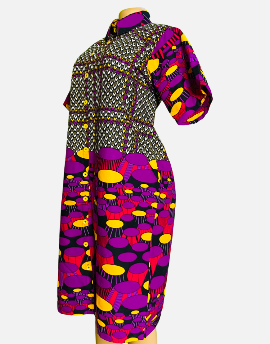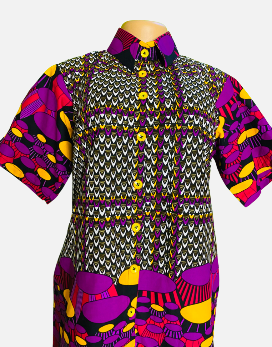 Slay this season with our Ankara Disc Design shirt dress. Crafted from chic purple fabric, the button down collar and shirt dress silhouette make it perfect for wearing with white trainers.